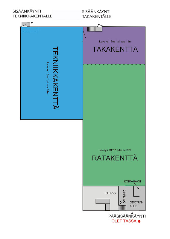Hallilta on varattavissa kolmea erikokoista kenttää: iso kenttä (ns. ratakenttä) 60 €/h, tekniikkakenttä 45€/h ja takakentä 25 €/h. Rata- ja tekniikkakentällä on pääsääntöisesti valmiit harjoitteet, joiden muuttamisesta on sovittava erikseen. Takakentällä on viisi putkea, 2 by 2-kepit, viisi hyppyä ja kaksi toko-hyppyä, madallettu keinu ja pentukeinu sekä rengas. Lisäksi takakentällä on rally-tokon kyltit (voi-mes) sekä kyltinpidikkeitä (24 kpl) ja muita treenaamisen oheistarvikkeita. Varaukset voitte tehdä asiakaspalveluumme [email protected].